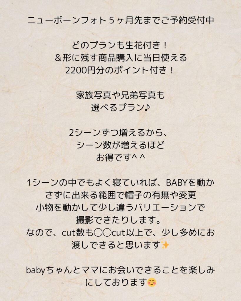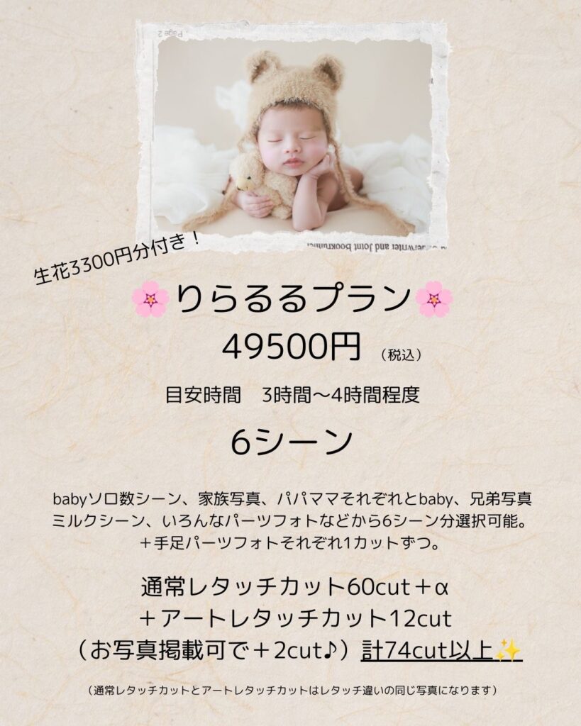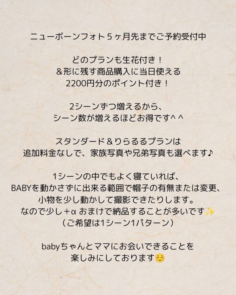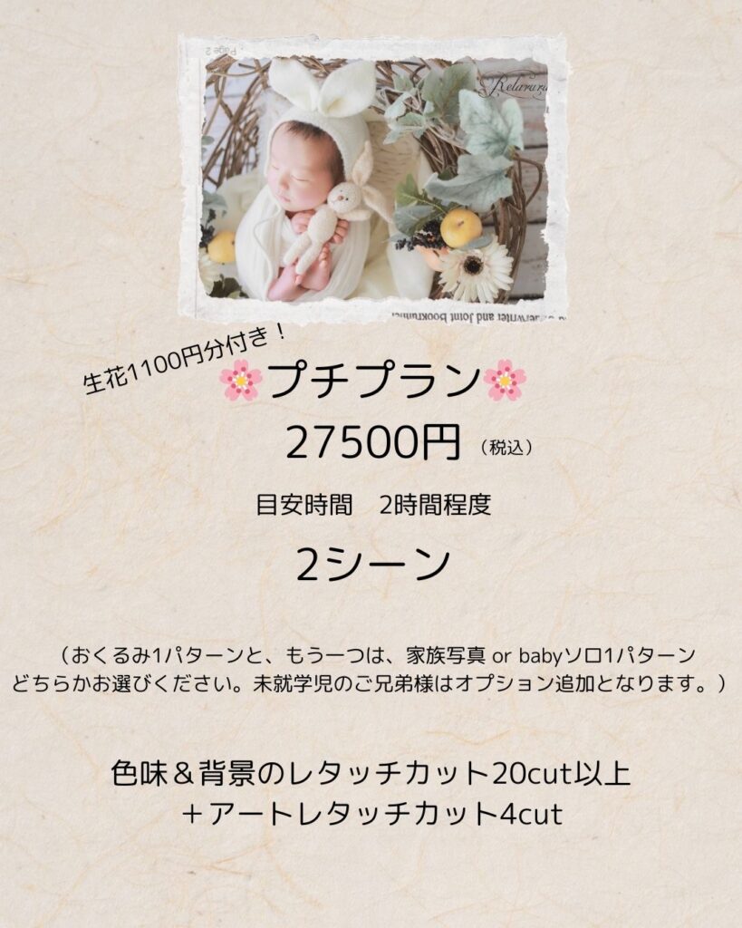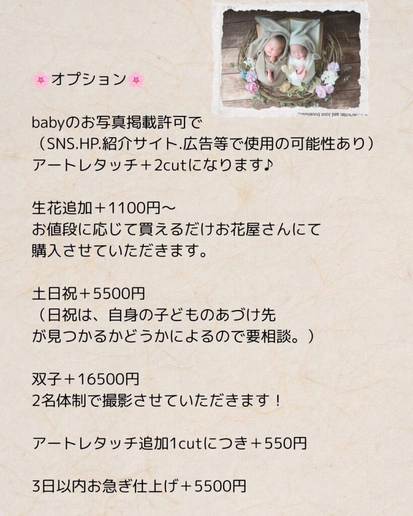 (未就学の兄弟・土日祝等のオプションや、交通費はポーズドニューボーンフォトと同じになります。)