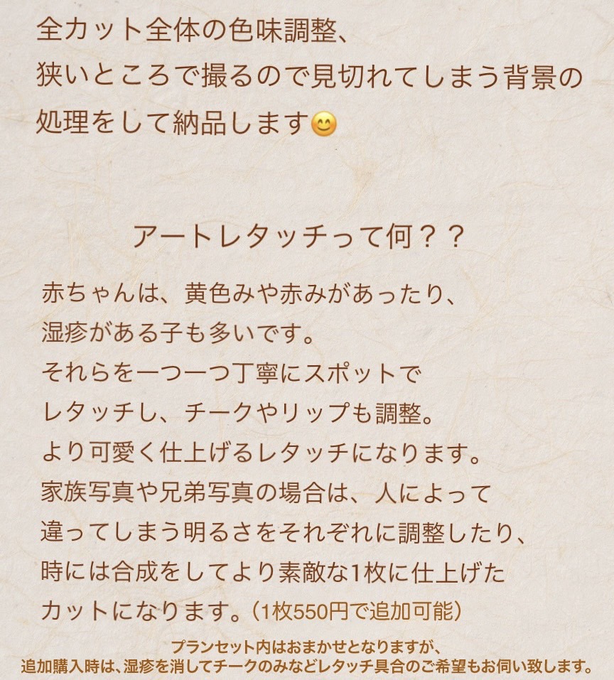 ミルクシーン+沐浴シーン+家族写真。お着換えのシーン等も含む。ご兄弟がいる時はその子次第ですが、自然の流れの中で撮れれば兄弟写真も撮影いたします。